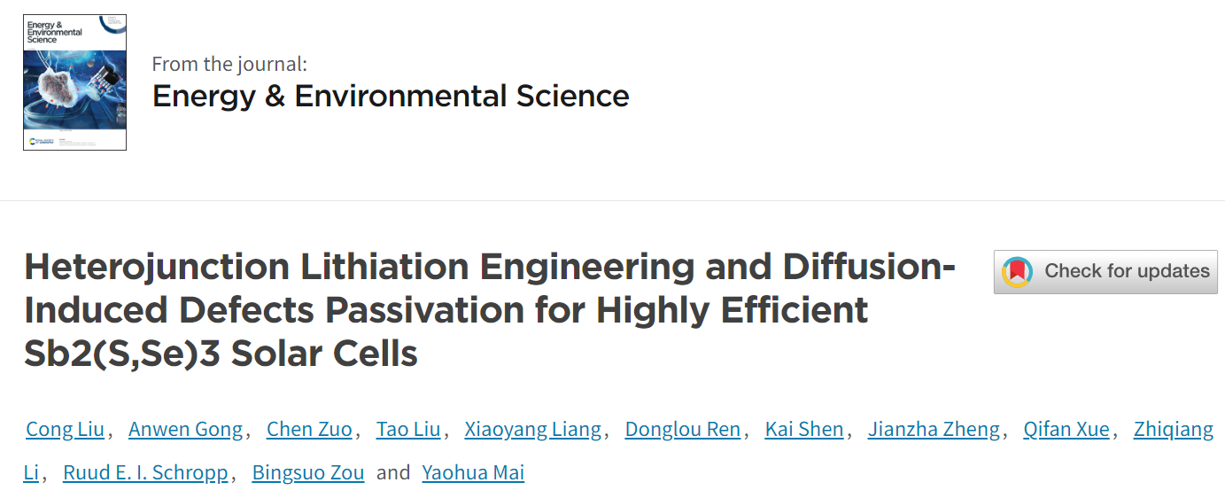 近日,能源领域顶级期刊Energy & Environmental Science(影响因子:32.4)以“Heterojunction Lithiation Engineering and Diffusion-Induced Defects Passivation for Highly Efficient Sb2(S,Se)3 Solar Cells”为题,报道了我院邹炳锁教授带领的团队关于硒硫化锑太阳电池的最新研究进展。该论文为我院首篇在Energy & Environmental Science期刊发表的研究论文,学院刘聪博士为第一作者和通讯作者,邹炳锁教授、刘焘教授和暨南大学麦耀华教授为共同通讯作者,永利集团3044为第一完成单位。本研究得到了国家自然科学基金(52402104)、广西自然科学基金(2024GXNSFBA010280)、广西八桂学者等项目的资金支持。