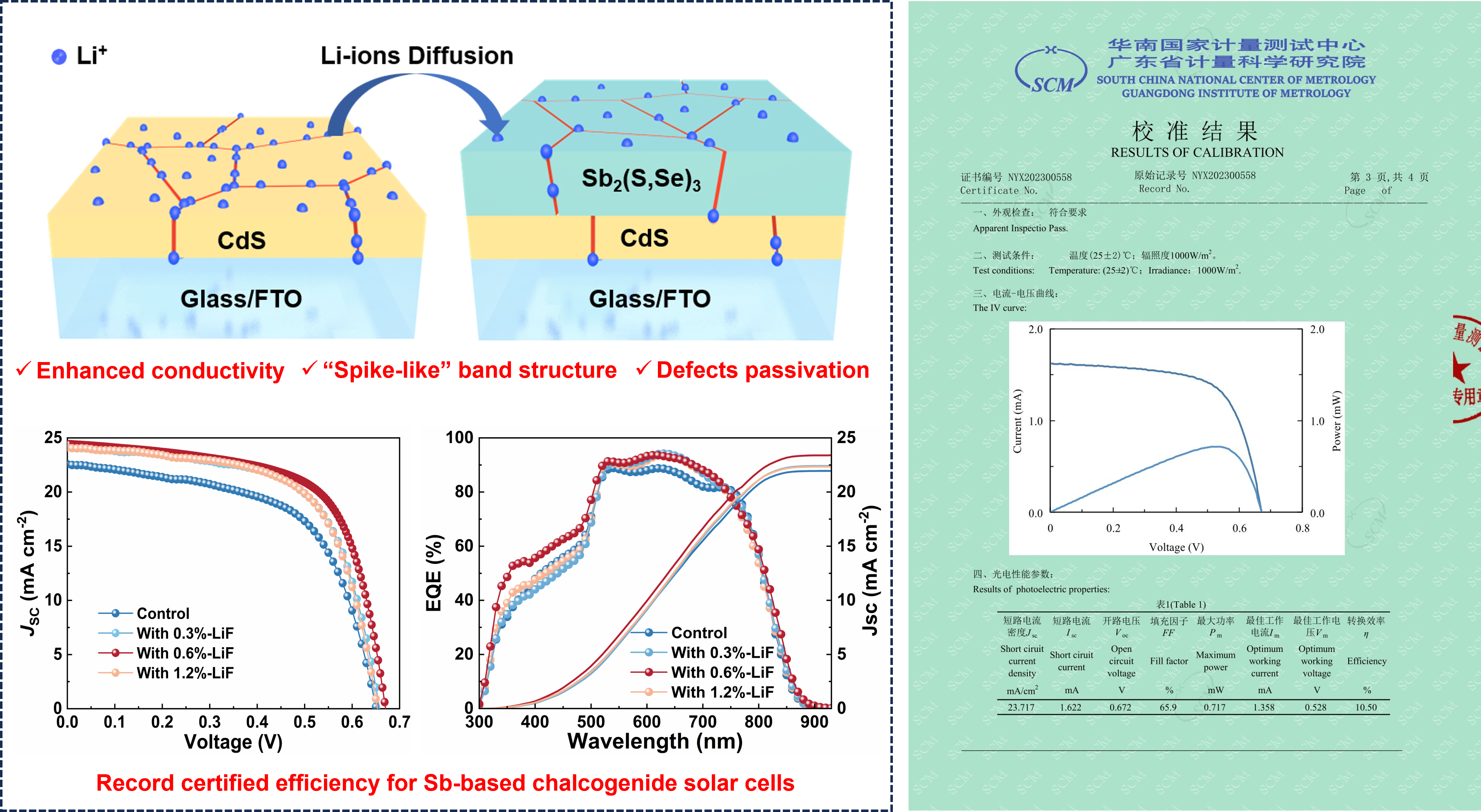 锑是一种重要的战略金属和化工原材料,同时也是重要的半导体材料,在广西属特色金属资源。作为一类新型的全无机半导体材料,Sb2(S,Se)3化合物凭借环境友好、成本低廉、带隙可调、光电性质优异等优势而获得了国内外的广泛关注。本文中研究团队通过在前驱体溶液中引入LiF以改善缓冲层CdS薄膜的导电性、形貌和n型特性。由此在水热法沉积Sb2(S,Se)3光吸收层时,具有高迁移率的锂离子会发生原位扩散,通过形成Li-S(e)键有效地钝化了该体系中易发生的硒空位(VSe)和锑反位(SbS)缺陷,显著减少了光生载流子损失;该锂化策略不仅实现了CdS缓冲层和Sb2(S,Se)3吸收层的双重优化,而且还在CdS/Sb2(S,Se)3异质结处形成了有利的能级排列和更宽的载流子耗尽区。通过这种新策略的优化举措,本文获得了Sb2(S,Se)3太阳电池实现了创纪录的10.76%的光电转换效率,为未来持续改进提供了新路。此外,该器件经国家计量测试中心测试,获得了10.50%的认证效率,这是迄今为止Sb基太阳电池的最高认证效率。