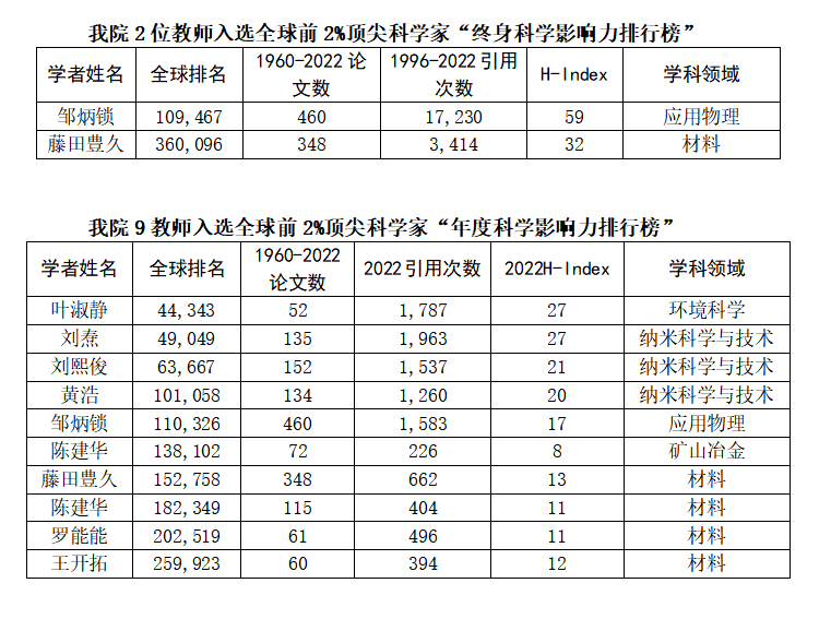 2023年10月4日,Elsevier与美国斯坦福大学发布了第六版全球前2%顶尖科学家榜单(World’s Top 2% Scientists 2022,数据来源:https://elsevier.digitalcommonsdata.com)。榜单分为关注整个学术生涯迄今影响力的“终身科学影响力排行榜”(全球上榜204643人,中国9013人),以及聚焦本年度学术成就的“年度科学影响力排行榜”(全球上榜210198人,中国23484人)。我院2位教师入选全球前2%顶尖科学家“终身科学影响力排行榜”,9位教师入选全球前2%顶尖科学家“年度科学影响力排行榜”。