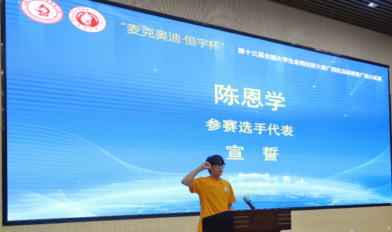 评委委员会代表、广西科技大学闫共芹老师,监督委员会主任、桂林科技大学陈国华老师,参赛学生代表永利集团3044陈恩学同学依次对恪尽职守参加比赛进行宣誓。