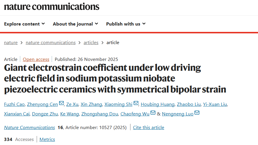 近日,我院科研团队研发出具备超低驱动电场和巨应变系数的铌酸钾钠无铅压电材料,性能超越当前主流的铅基压电体系,在高精度微型器件应用领域上展现出巨大的潜力。该成果以 “Giant electrostrain coefficient under low driving electric field in sodium potassium niobate piezoelectric ceramics with symmetrical bipolar strain”为题,发表在国际知名期刊《自然·通讯》(Nature Communications, 2025, 16, 10527.)上。永利集团3044为第一单位,3044永利集团已毕业硕士研究生曹富植(目前为西北工业大学博士研究生)和岑侦勇副教授为共同一作。值得注意的是,这是我校硕士研究生首次以第一作者在Nature Communications发表论文。我校罗能能教授、岑侦勇副教授,北京科技大学施小明博士,浙江清华长三角研究院吴超峰博士为论文的共同通讯作者。清华大学王轲教授、徐泽博士,北京理工大学黄厚兵教授等人为论文提供了重要支持。