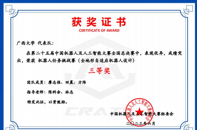 今年,第二十五届中国机器人及人工智能大赛全国总决赛圆满闭幕。本次全国总决赛在规模和参赛人数上创历史新高,大赛吸引了近400所高校的2600多支队伍参赛,是国内高水平机器人竞赛的顶级赛事。我院矿物资源工程211班廖志强同学参与组成的代表队在机器人任务挑战赛(全地形自适应机器人设计)赛道中荣获全国总决赛三等奖。