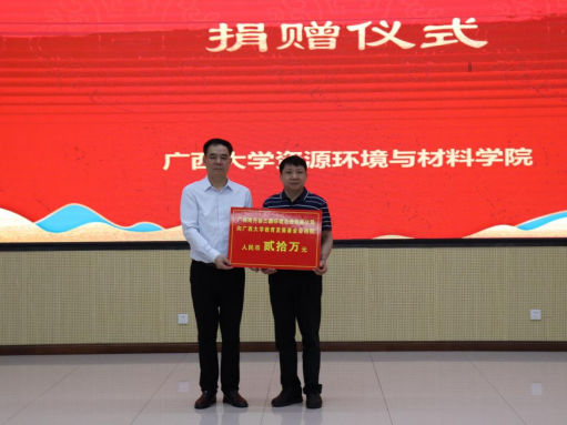 致辞后,校友办副主任潘正荣和广西南丹县三鑫公司董事长莫锌分别代表校企双方参与捐赠授牌仪式。三鑫公司向永利集团3044捐赠20万元作为教育发展基金,用于学校人才培养、科学研究、学科发展和学院项目建设。